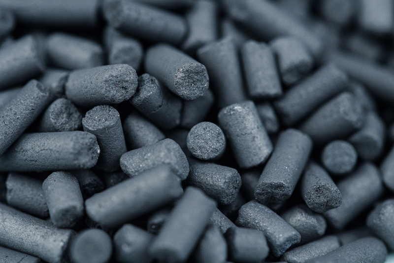 本产品主要是用来脱除氨气、甲胺、二甲胺、三甲胺、乙胺等含胺类的碱性气体。由于活性炭生产过程中本身处于弱碱性环境,因此利用自身能力吸附碱性气体难以达到高效的去除效果。因此在生产过程中,利用孔的工艺控制技术调整基炭孔隙,达到较好承载酸性物质的能力,并通过后期加工载入酸性物质,在使用过程中,达到既吸附碱性气体又进行中和反应,从而提高产品对碱性物质的吸附效果。